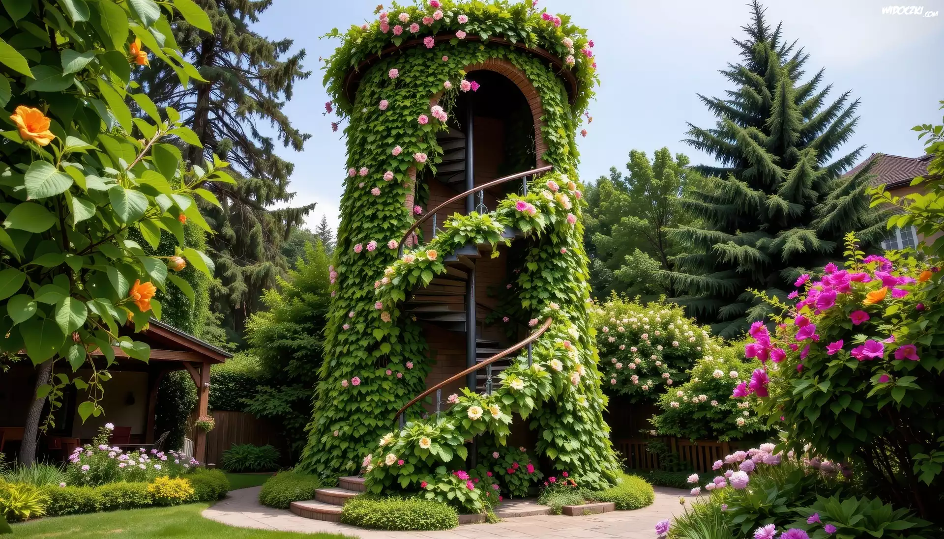 Zdjęcia, Ogród, Wieża, Kwiaty, Bluszcz