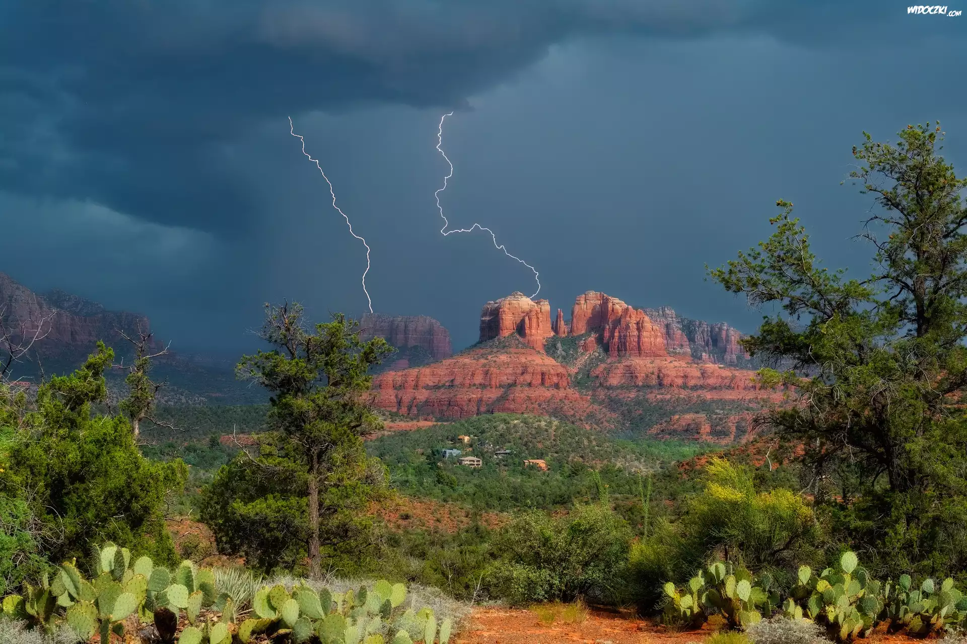 Stany Zjednoczone, Arizona, Sedona, Skały, Cathedral Rock, Chmury, Pioruny, Błyskawice, Drzewa, Kaktusy |