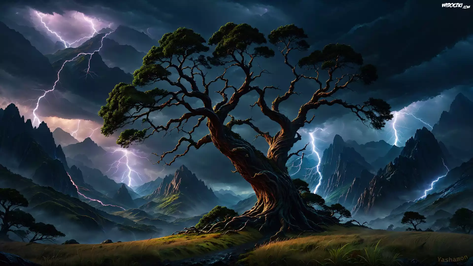 Grafika, Góry, Drzewo, Błyskawice