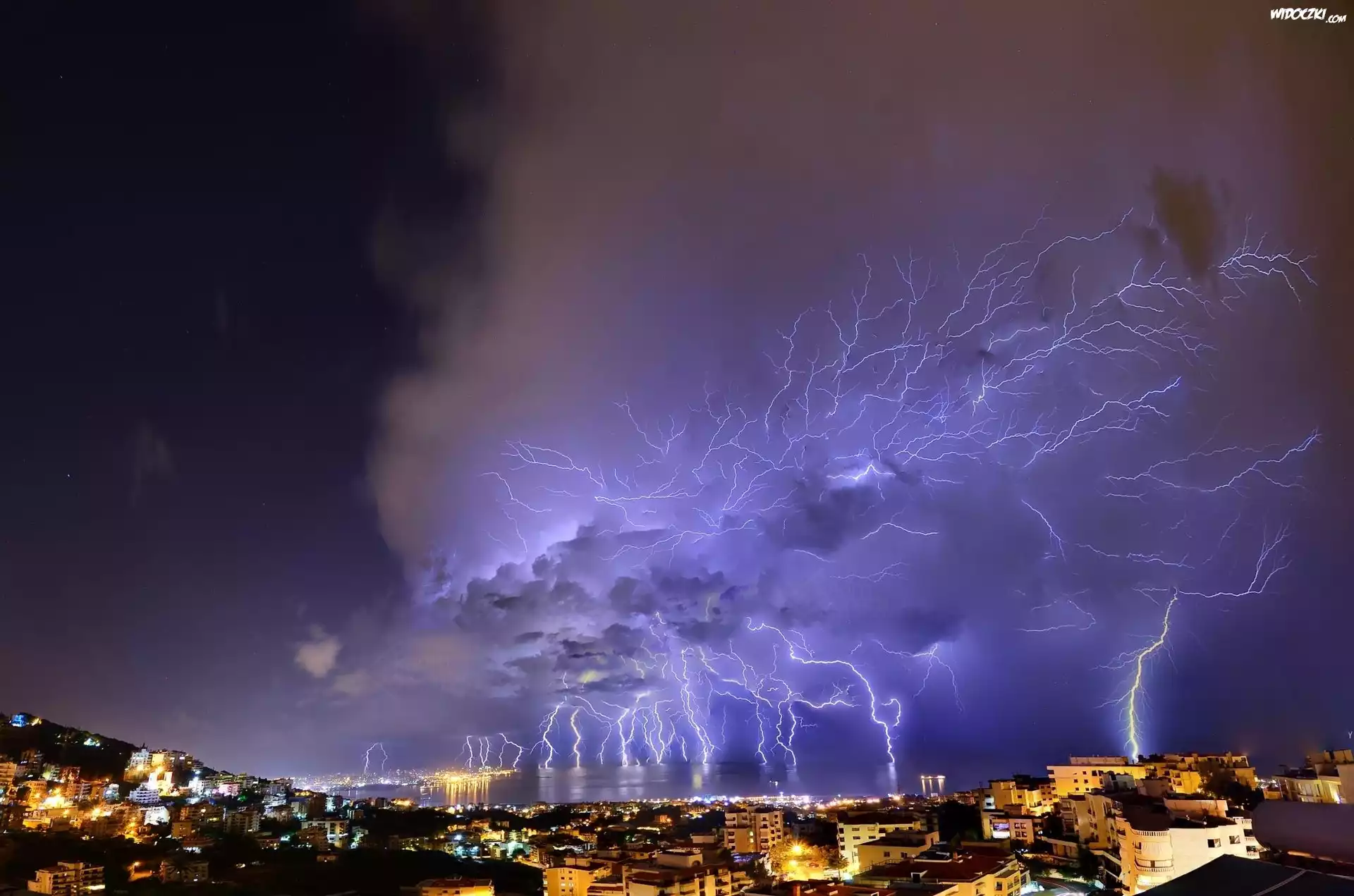 Zdjęcia, Błyskawice, Niebo, Miasto, Noc