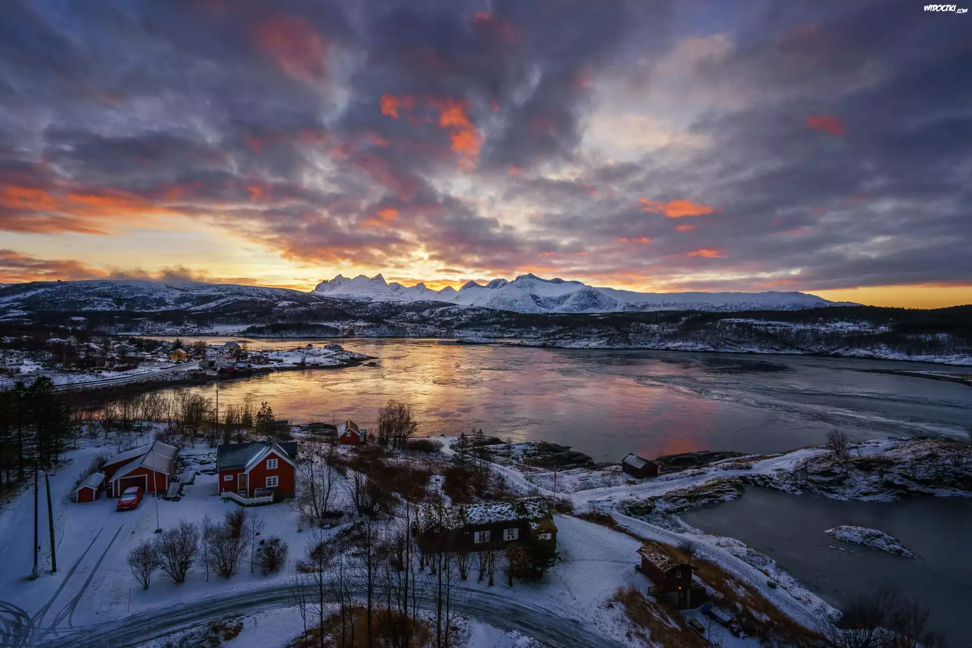 Norwegia, Region Nordland, Gmina Bodø, Cieśnina Saltstraumen, Zima, Rzeka, Domy, Chmury, Wschód słońca |