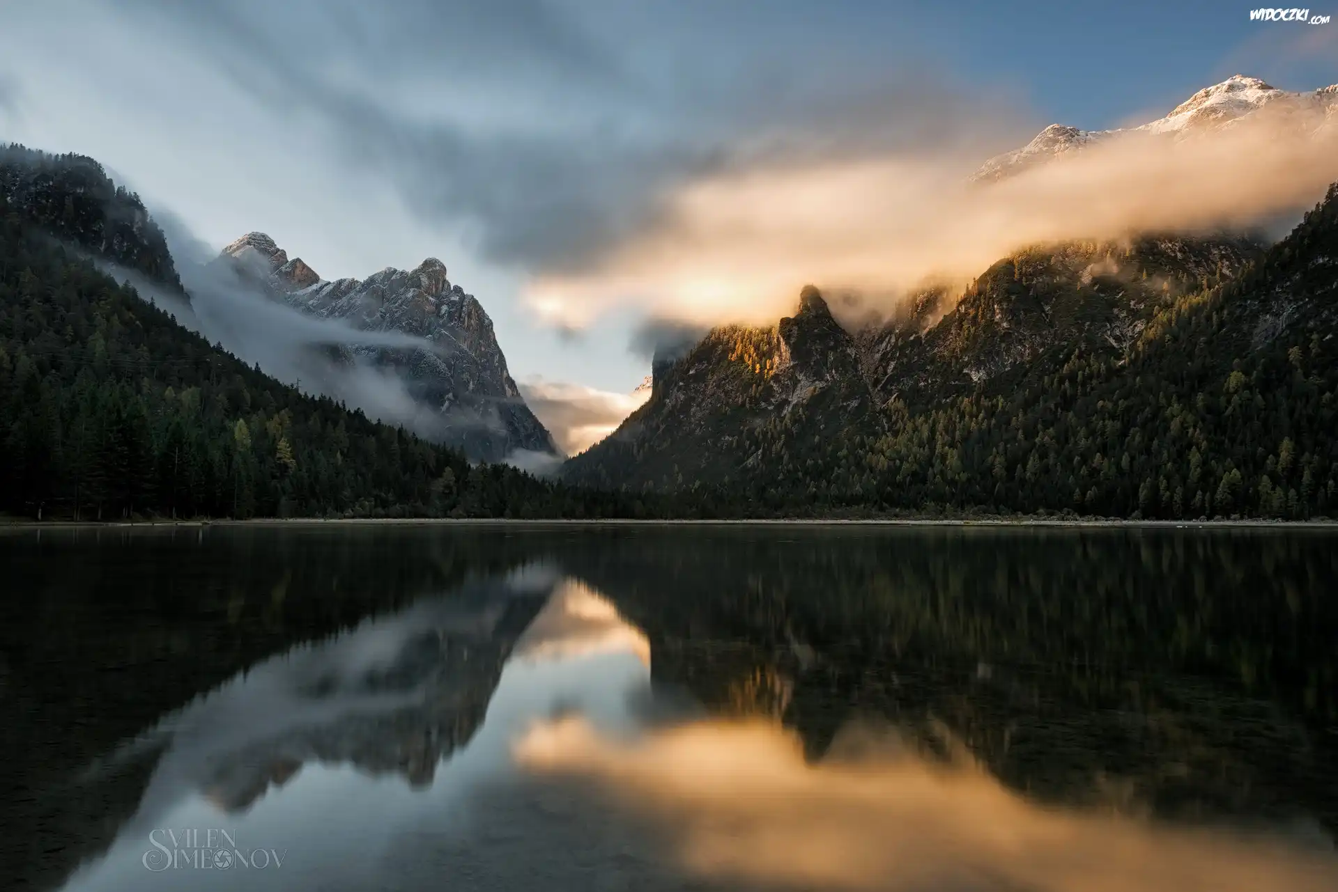 Góry, Dolomity, Drzewa, Jezioro Toblacher See, Lago di Dobbiaco, Chmury, Odbicie, Prowincja Bolzano, Włochy |