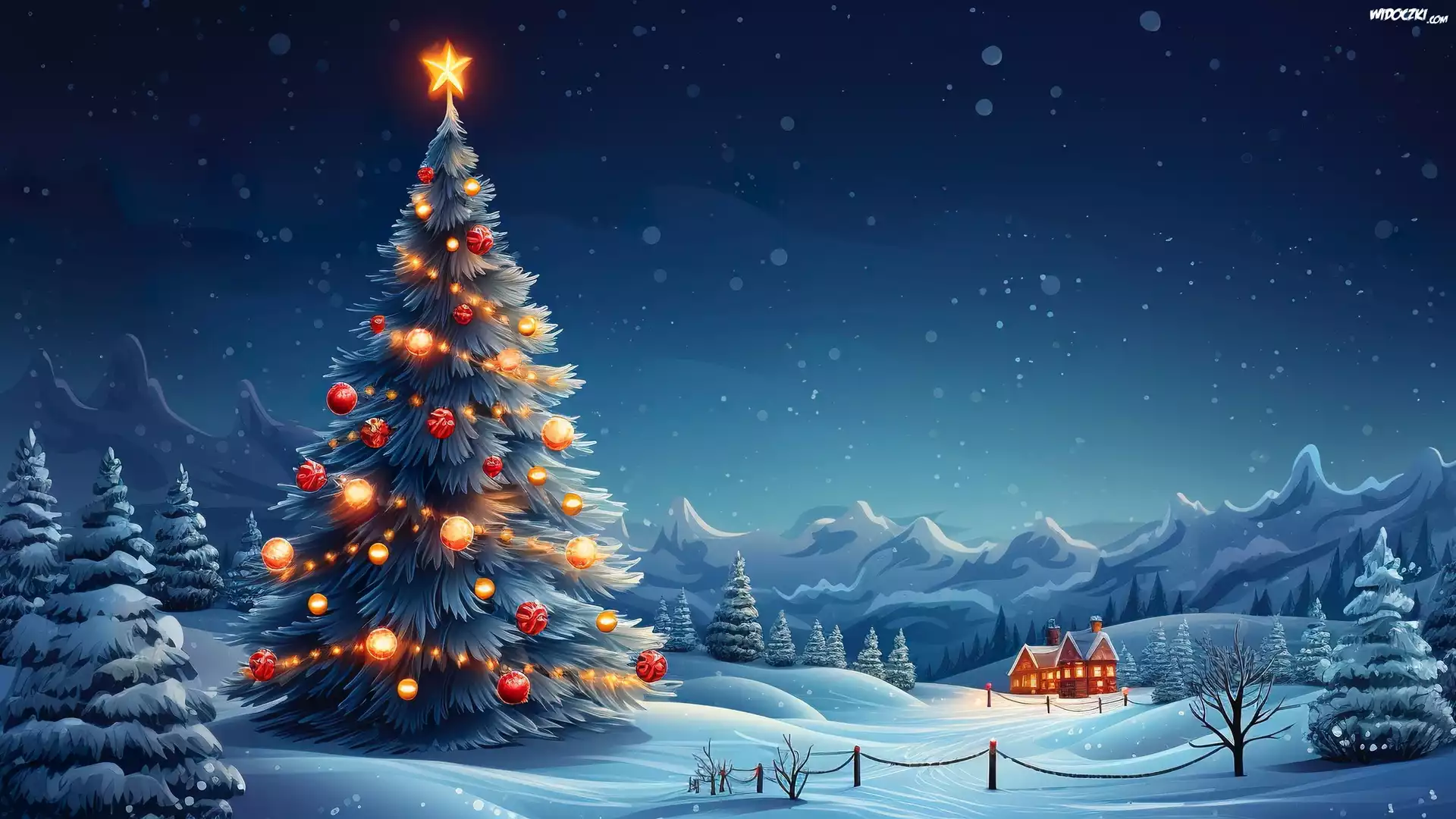Zdjęcia, Boże Narodzenie, Choinka, Bombki, Zima, Domy, Grafika