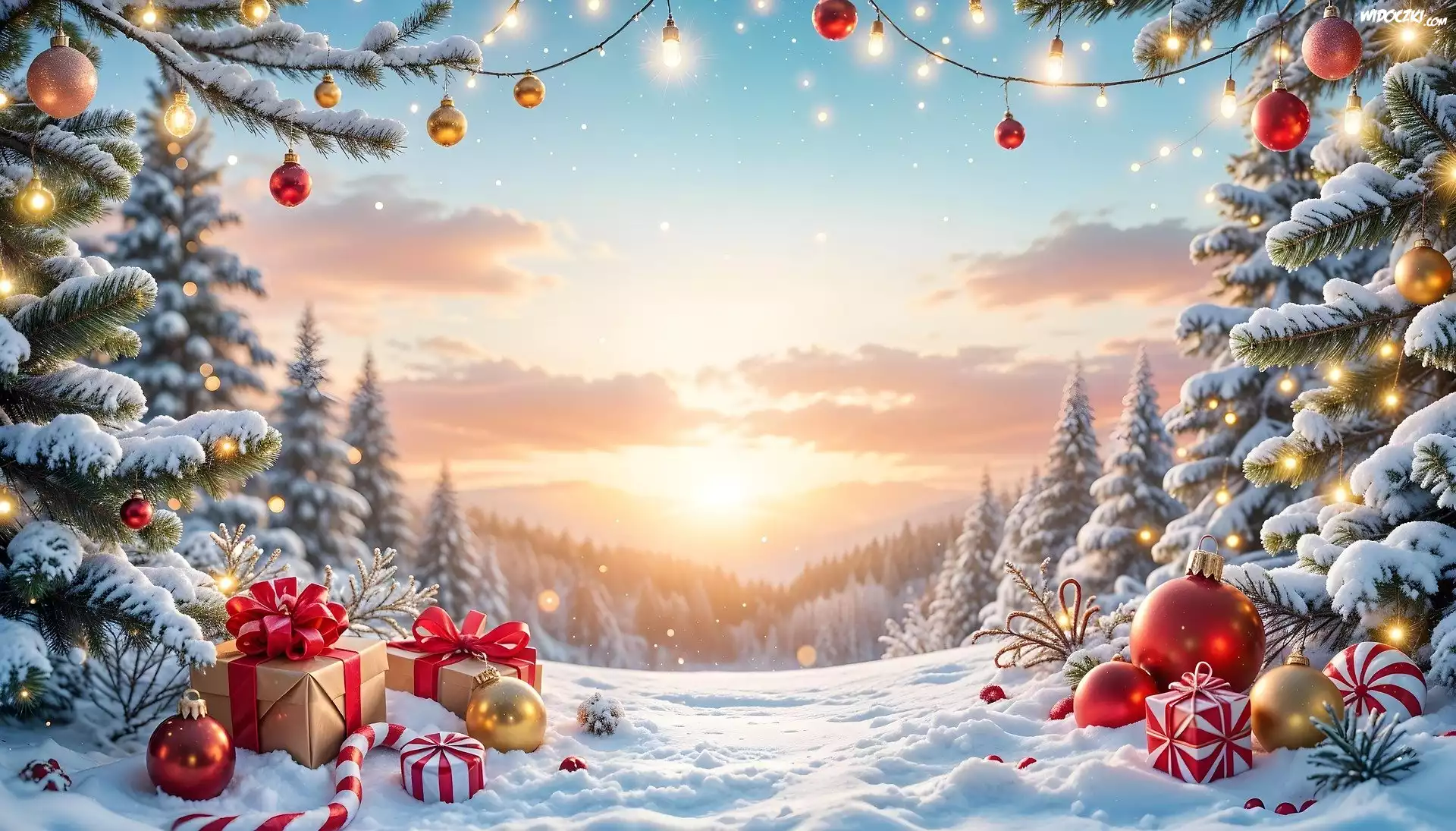 Zdjęcia, Boże Narodzenie, Prezenty, Bombki, Śnieg, Choinki