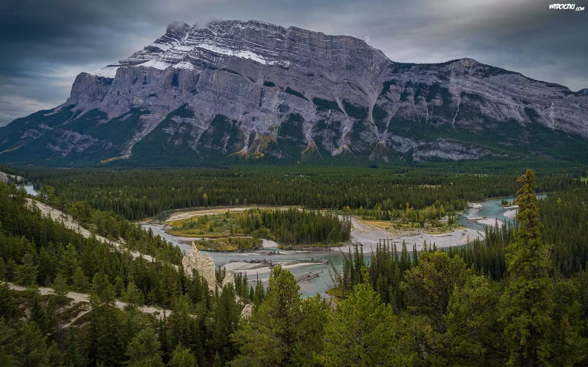 Zdjęcia, Góry, Rzeka, Bow River, Drzewa, Świerki, Park Narodowy Banff, Alberta, Kanada