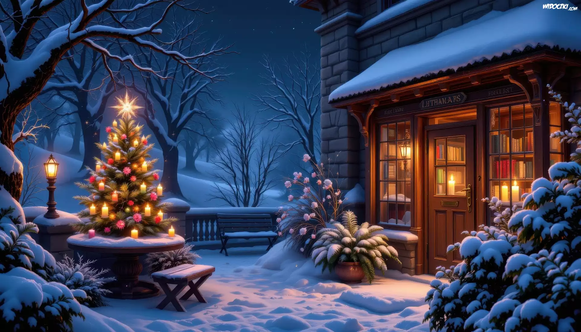Zdjęcia, Boże Narodzenie, Dom, Oświetlony, Drzewa, Ośnieżone, Choinka, Zima, AI