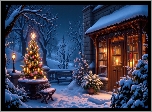 Boże Narodzenie, Dom, Oświetlony, Drzewa, Ośnieżone, Choinka, Zima, AI