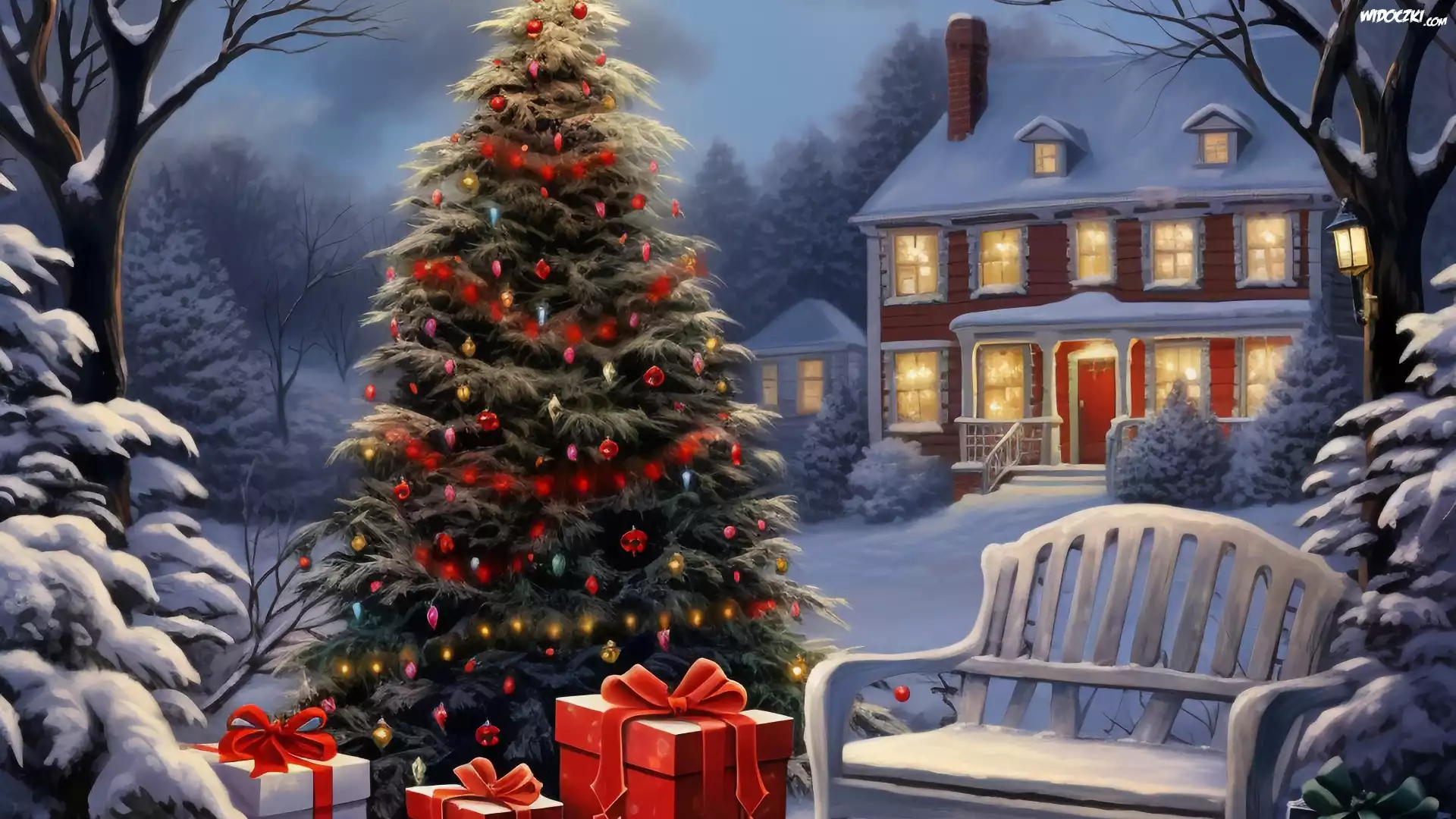 Zdjęcia, Zima, Śnieg, Choinka, Prezenty, Ławka, Dom, Światła, Ośnieżone, Drzewa, Boże Narodzenie, Grafika