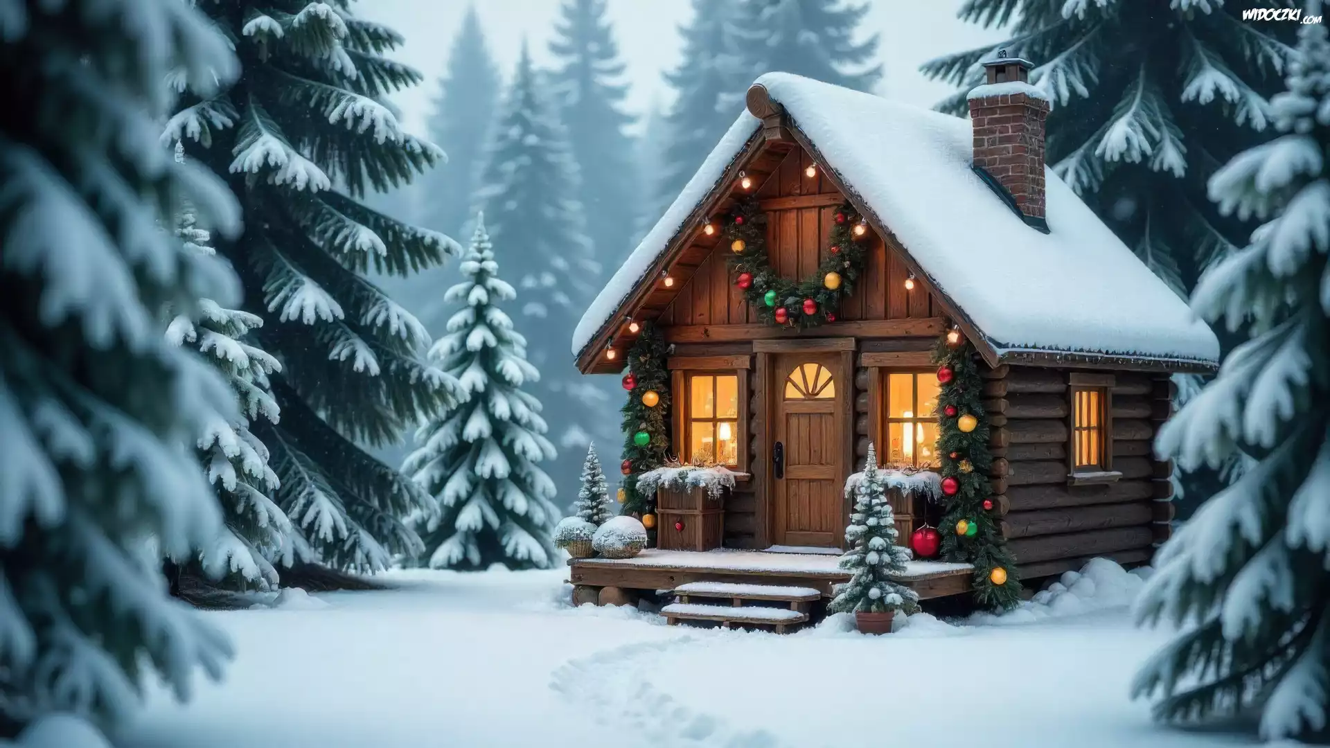 Zdjęcia, Boże Narodzenie, Zima, Las, Ośnieżone, Drzewa, Dom, Grafika AI