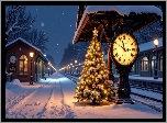 Boże Narodzenie, Zima, Choinka, Zegar, Stacja, Dworzec, Peron, Noc