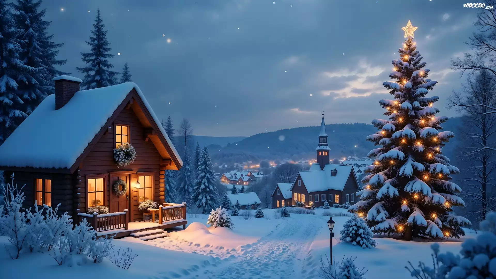 Zdjęcia, Boże Narodzenie, Dom, Oświetlony, Choinka, Kościół, Góry, Zima, AI