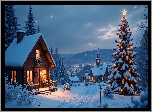 Boże Narodzenie, Dom, Oświetlony, Choinka, Kościół, Góry, Zima, AI