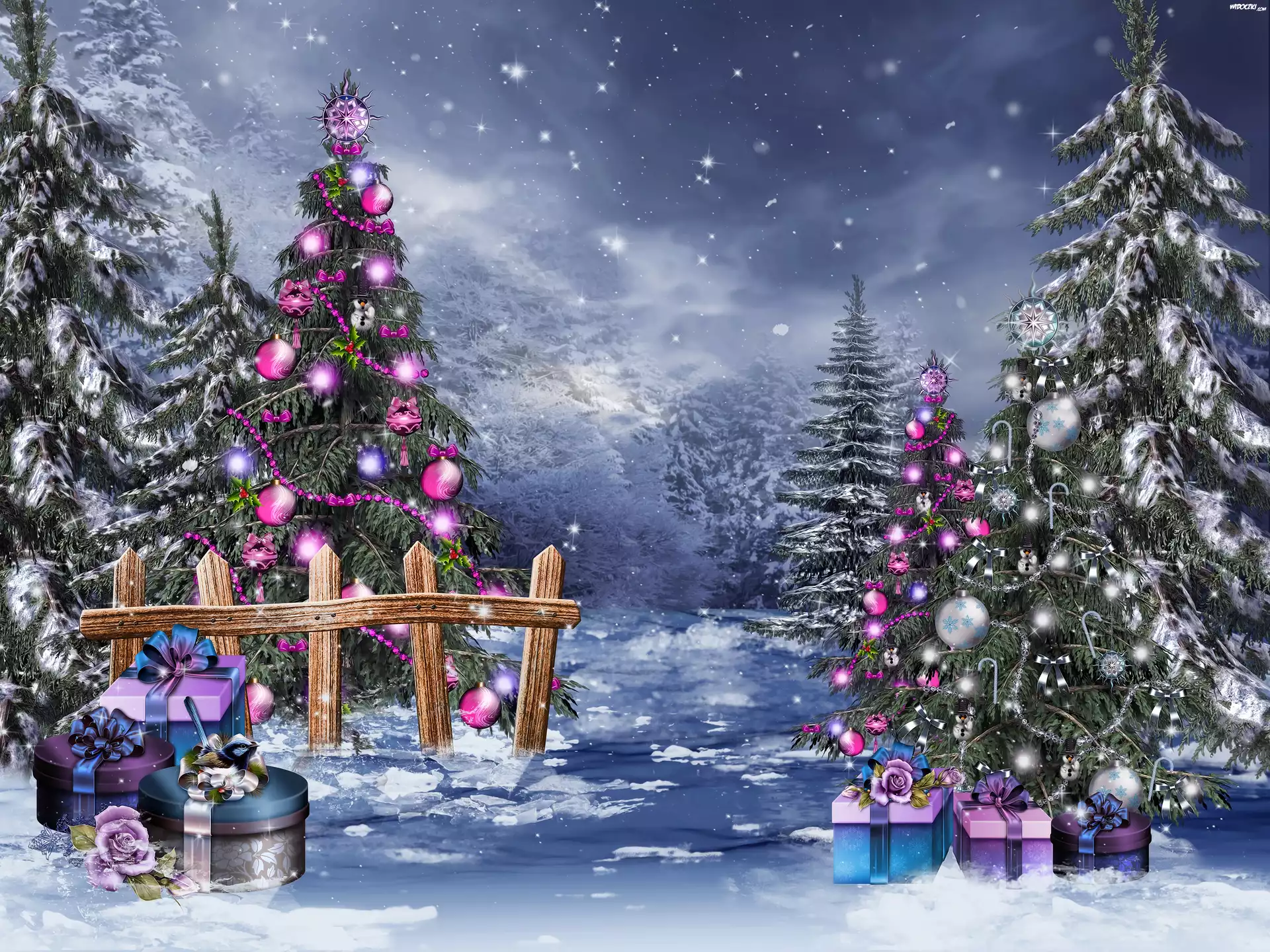 Boże, Narodzenie, Zima, Choinki, Góry, Prezenty