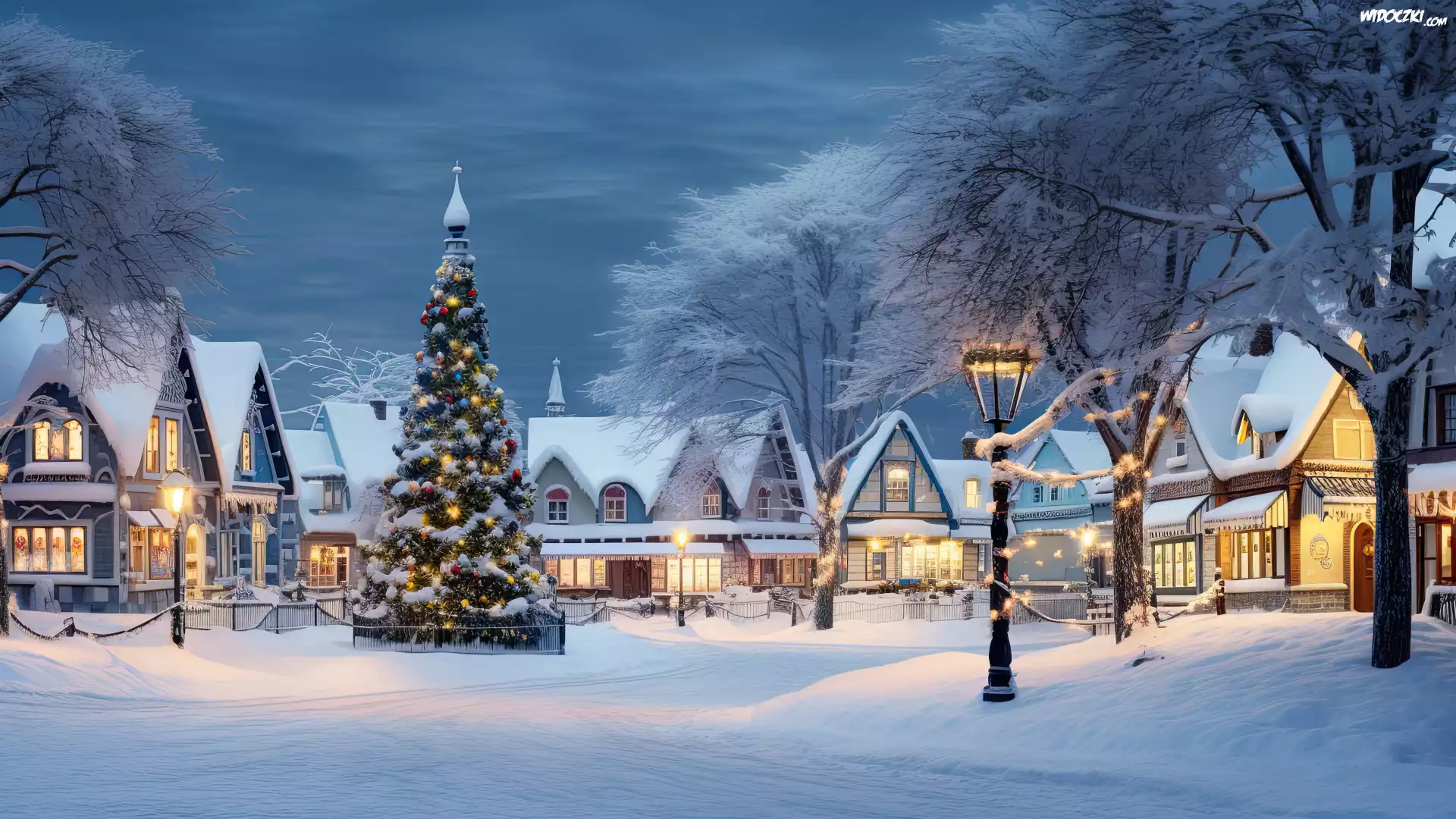 Zdjęcia, Boże Narodzenie, Zima, Ulica, Domy, Oświetlenie, Choinka, Drzewa, Latarnie, Grafika