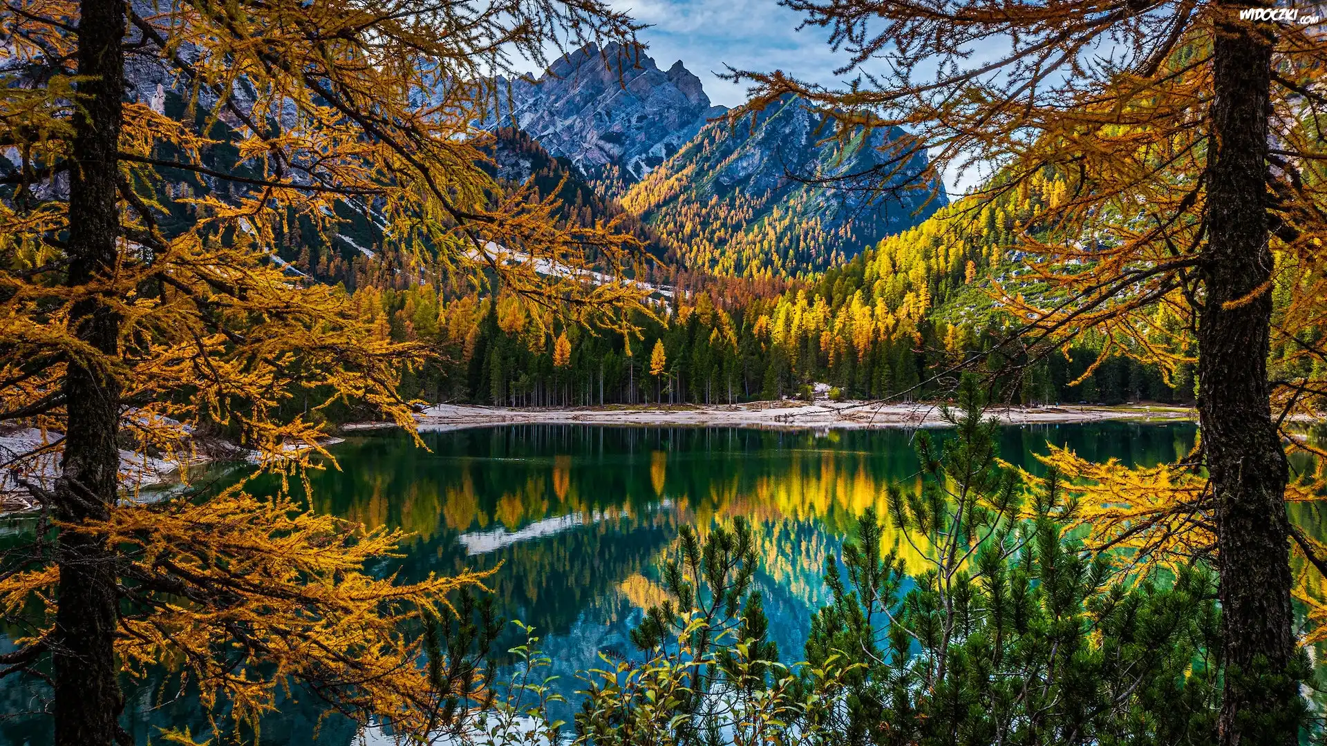 Zdjęcia, Jezioro, Pragser Wildsee, Lago di Braies, Góry, Dolomity, Tyrol, Włochy, Jesień, Drzewa