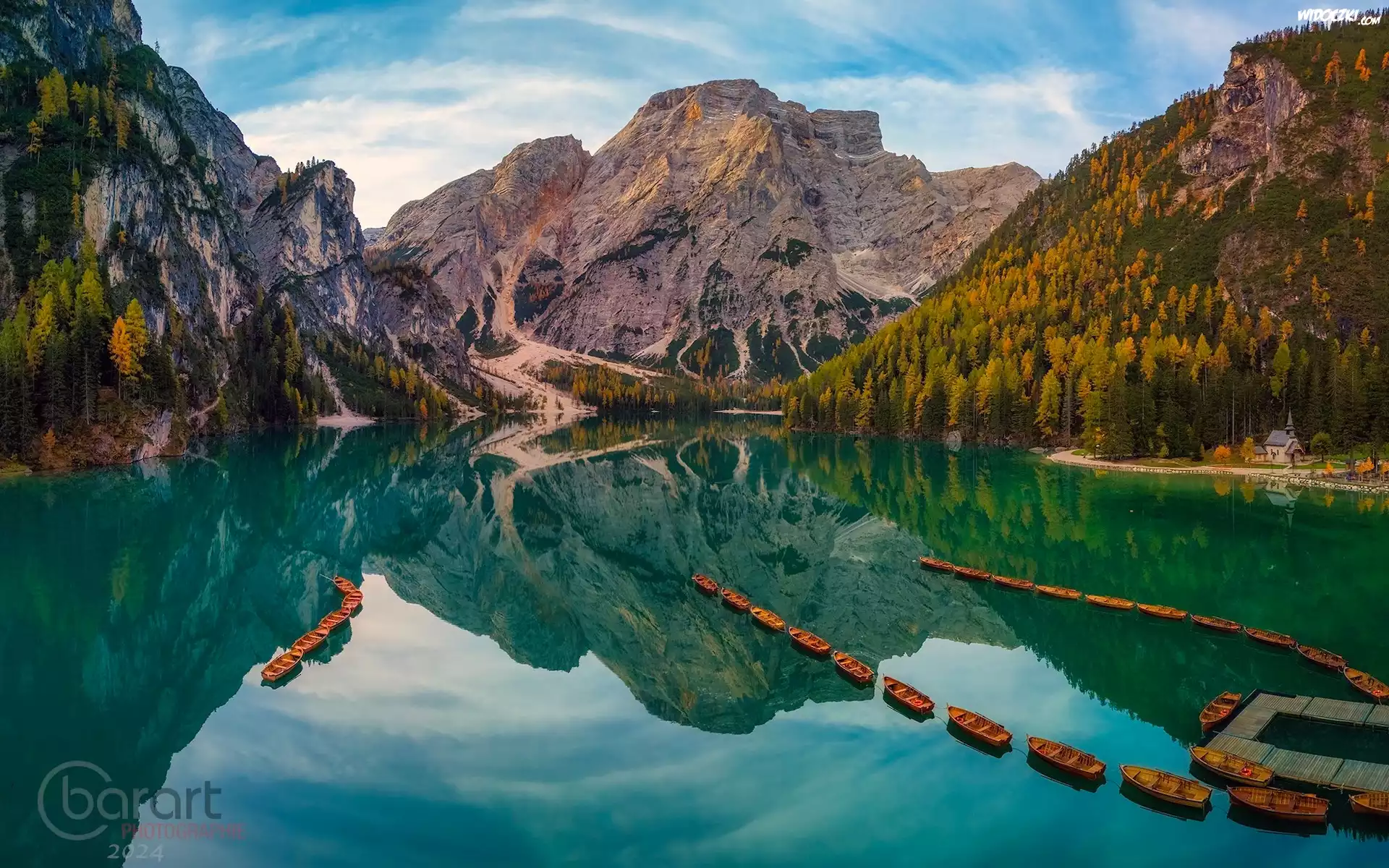 Włochy, Południowy Tyrol, Jezioro, Pragser Wildsee, Lago di Braies, Góry, Dolomity, Łódki, Pomost, Lasy |