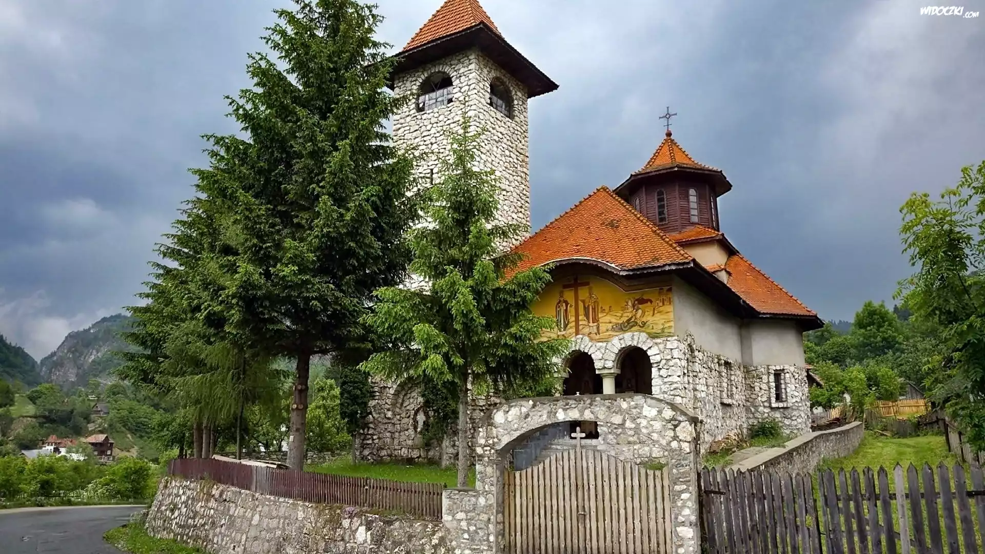 Zdjęcia, Braszów, Kościół, Domy, Wzgórza, Roślionność