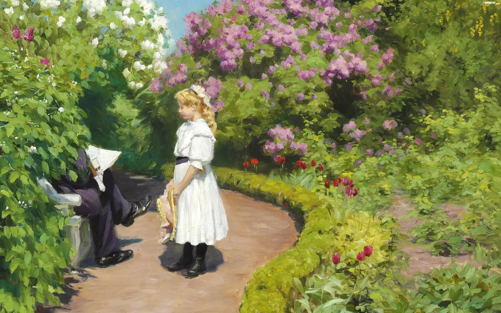 Zdjęcia, Park, Ogród, Kwiaty, Dziewczynka, Kapelusz, Malarstwo, Hans Andersen Brendekilde