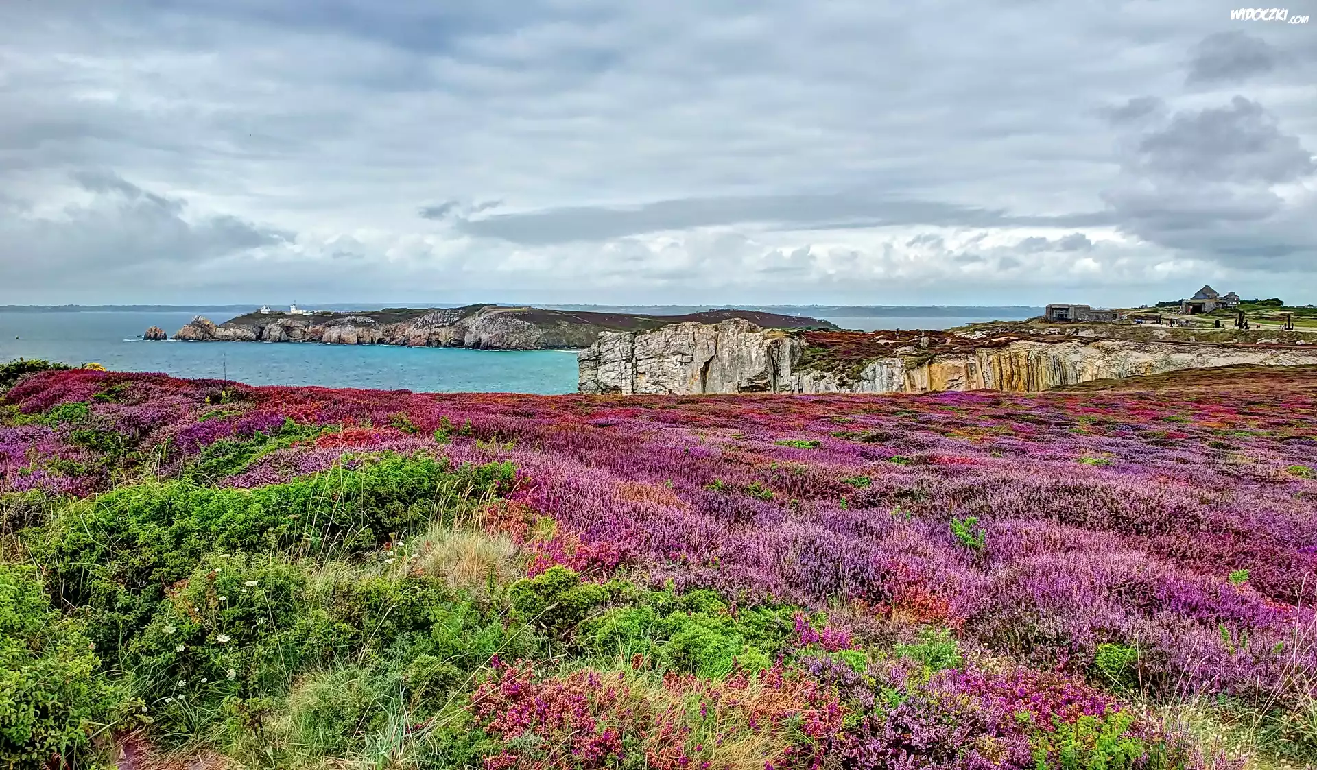 Zdjęcia, Bretania, Morze, Wybrzeże, Klify, Wrzosowisko