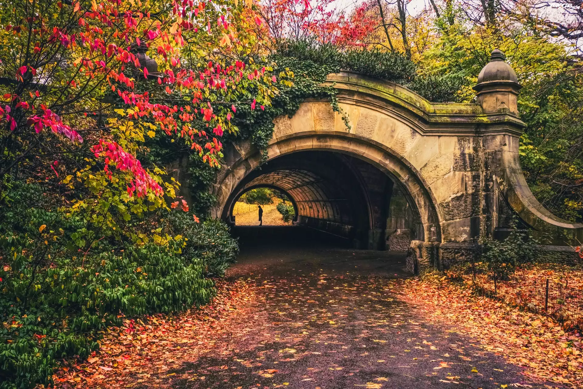Park, Kwiaty, Liście, Most, Stany Zjednoczone, Nowy Jork, Brooklyn