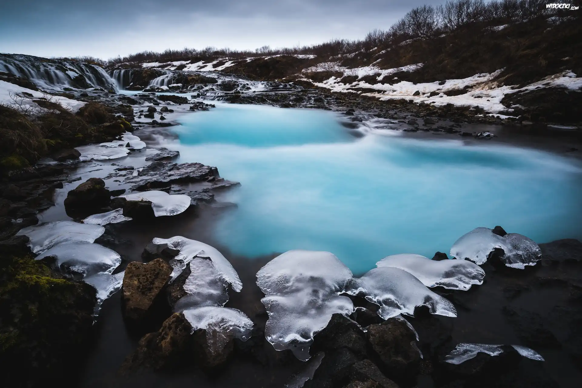 Zdjęcia, Rzeka Bruara, Wodospad Bruarfoss Waterfall, Islandia, Zima, Śnieg