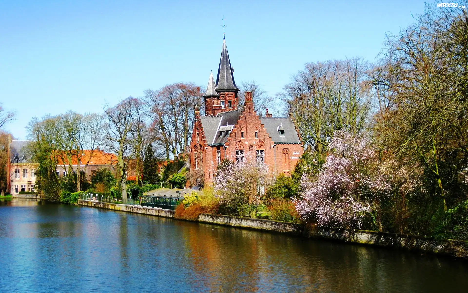 Zdjęcia, Brugia, Kanał, Pałacyk, Domy, Drzewa