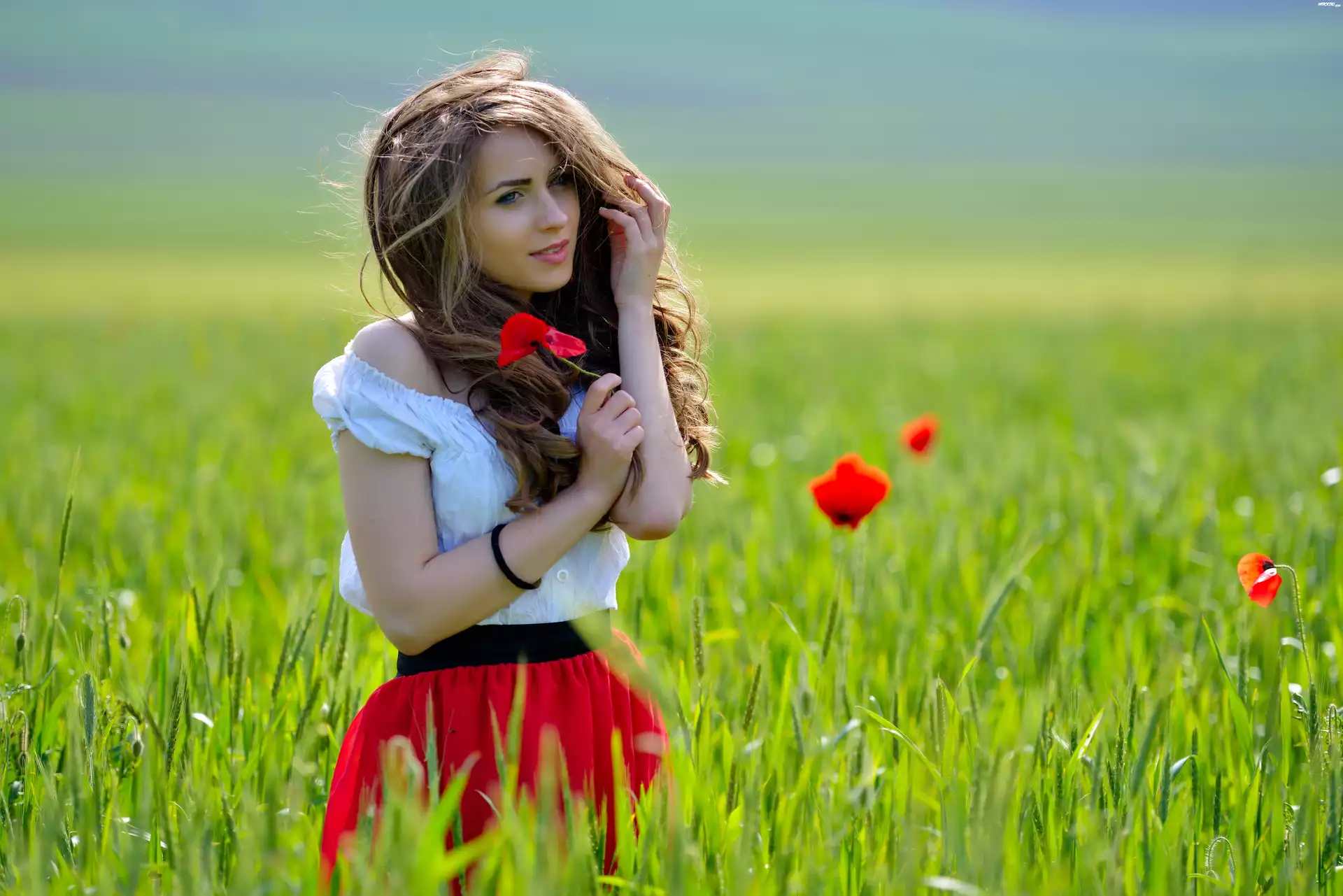 Brunetka, Czerwona, Spódnica, Łąka, Maki