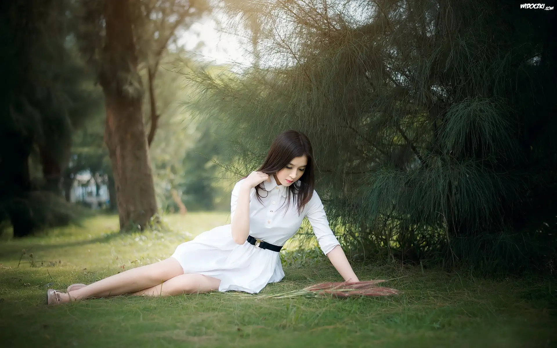 Brunetka, Biała, Sukienka, Park, Drzewa, Trawa