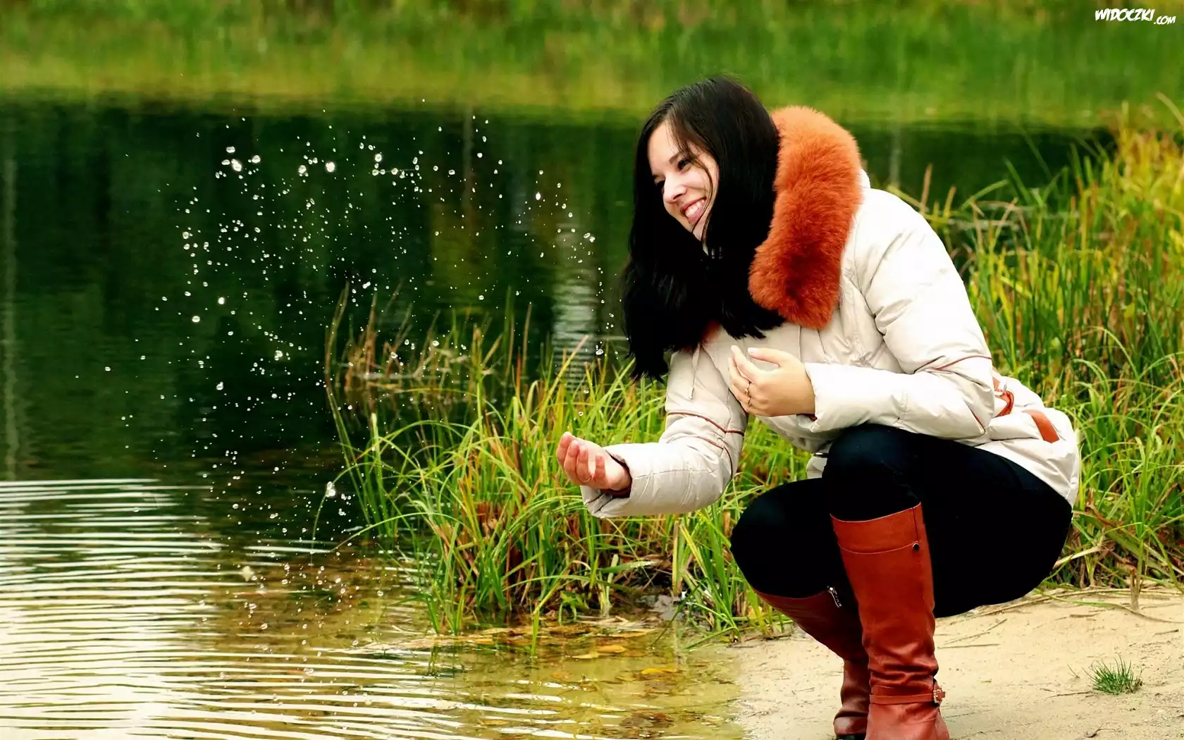 Zdjęcia, Brunetka, Uśmiech, Park, Staw, Jeziorko, Trawa