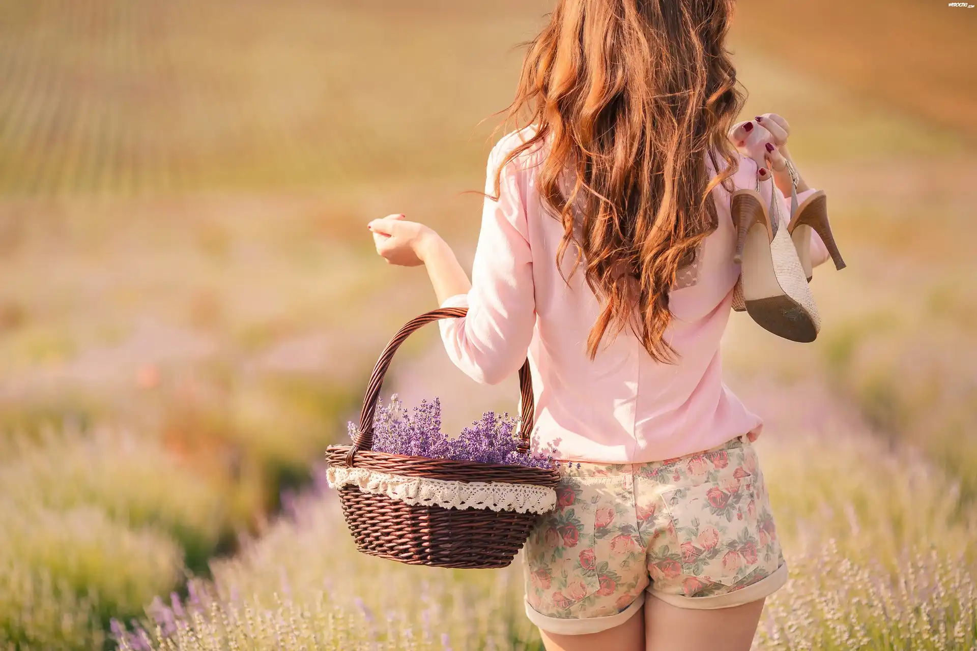 Zdjęcia, Brunetka, Łąka, Koszyk, Lawenda, Buty