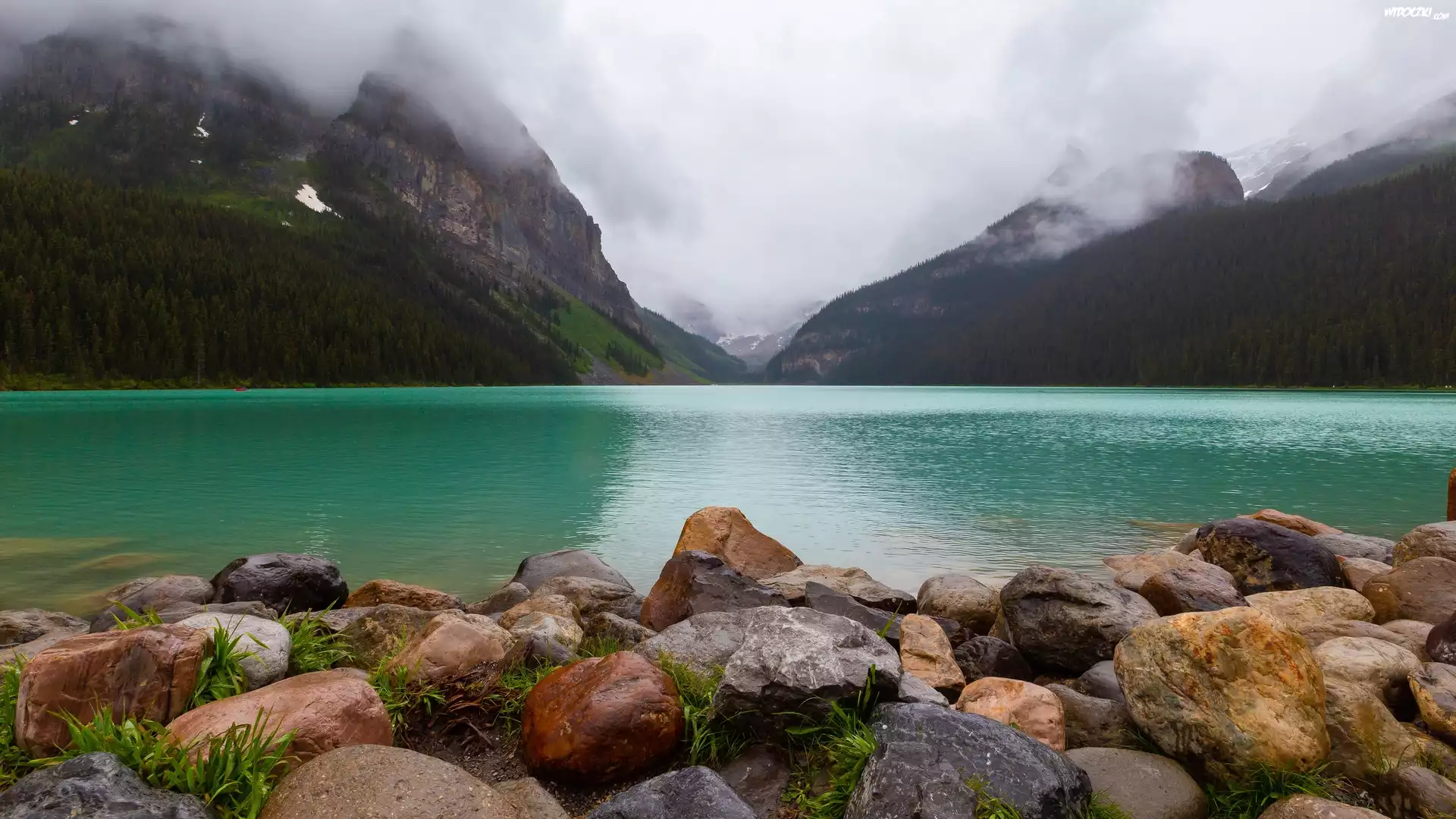 Zdjęcia, Jezioro, Brzeg, Kamienie, Góry, Drzewa, Las, Mgła