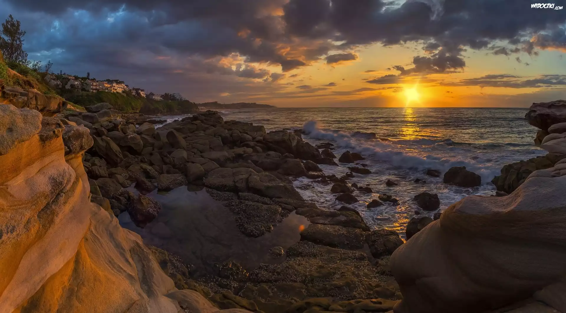 Zdjęcia, Morze, Brzeg, Kamienie, Skały, Domy, Zachód słońca