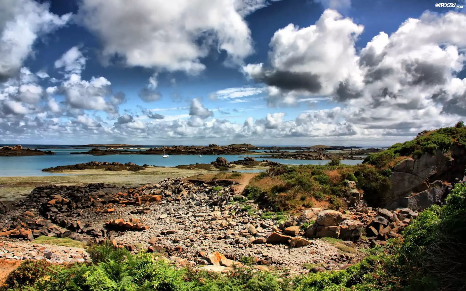 Zdjęcia, Brzeg, Kamienie, Wysepki, Niebo, Chmury