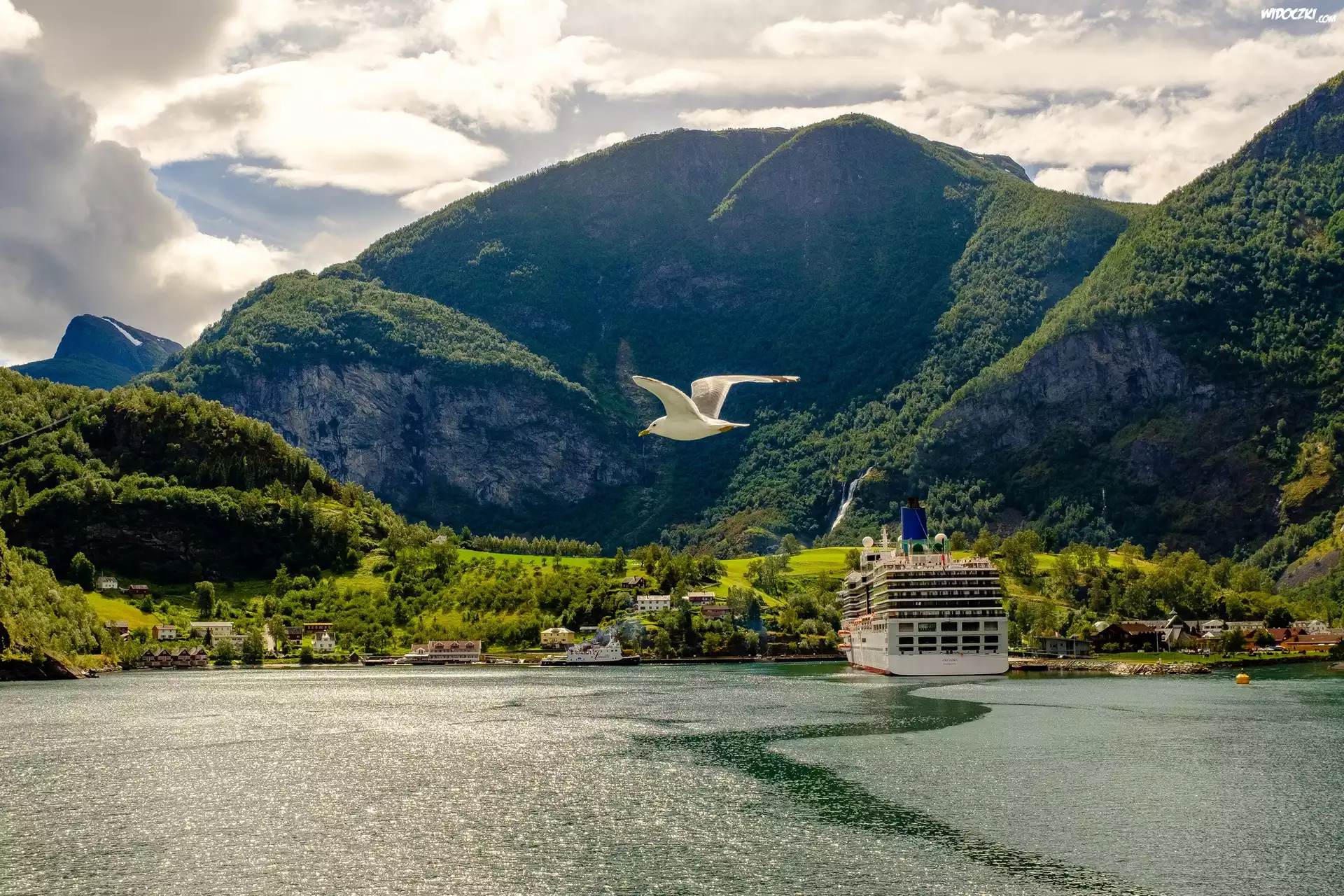 Zdjęcia, Góry, Brzeg, Fiord Aurlandsfjord, Statek, Mewa, Aurland, Norwegia