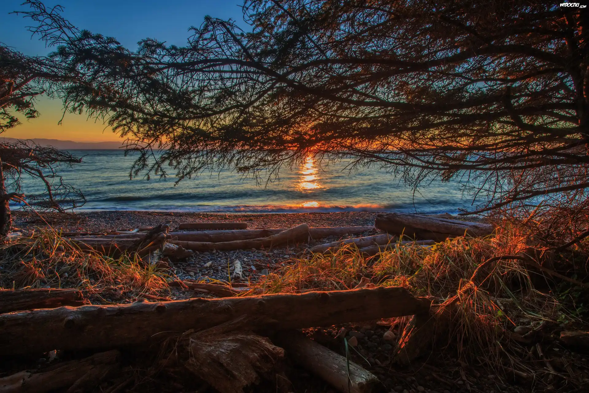 Zdjęcia, Brzeg, Jeziora, Wschód, Słońca, Kłody
