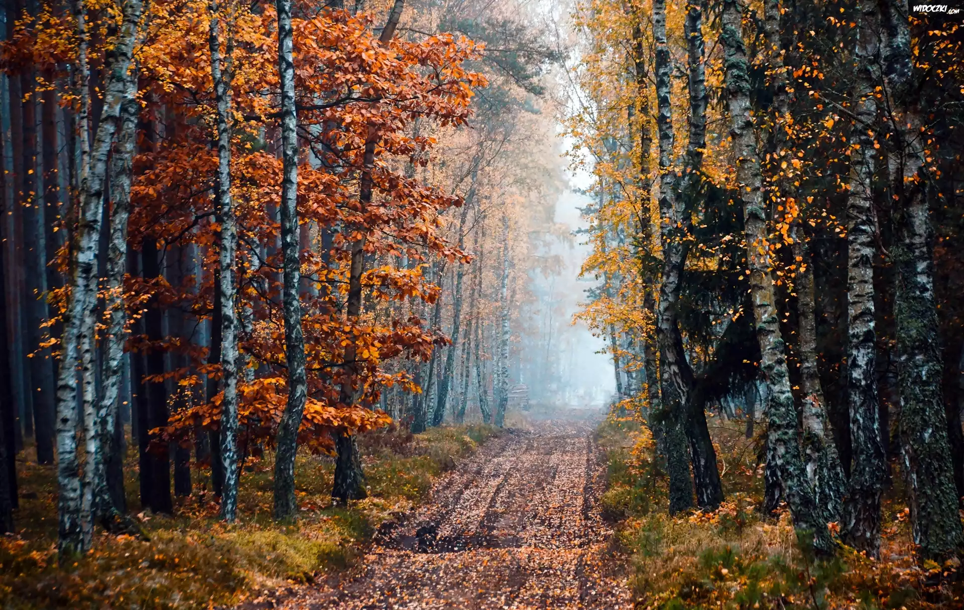 Zdjęcia, Brzozowy, Las, Droga, Mgła, Jesień