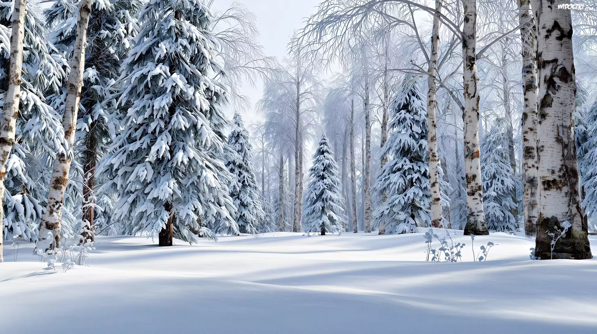 Zima, Las, Drzewa, Brzozy, Åšwierki, Grafika AI