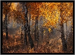 Jesień, Las, Drzewa, Brzozy, Liście, Trawa, Mgła