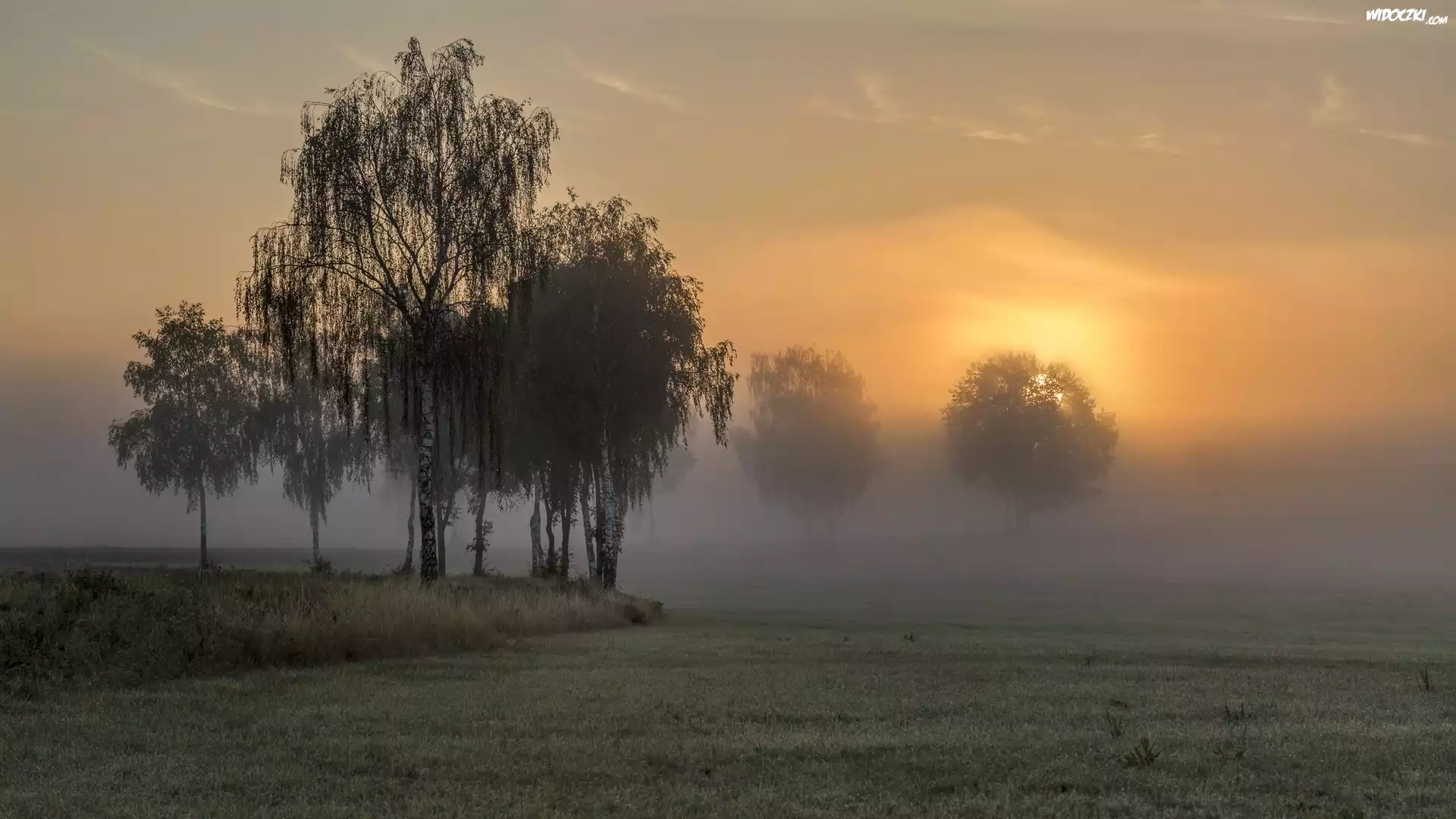 Pola, Trawa, Drzewa, Brzozy, Mgła, Wschód słońca