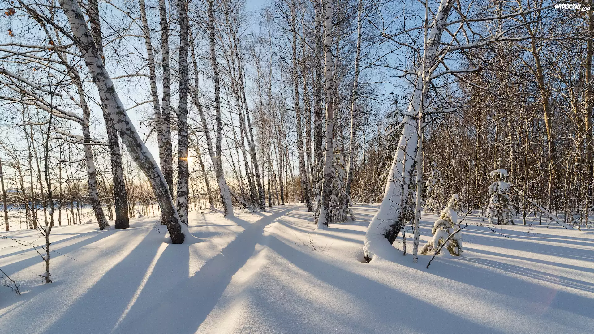 Zdjęcia, Drzewa, Brzozy, Las, Zima, Śnieg