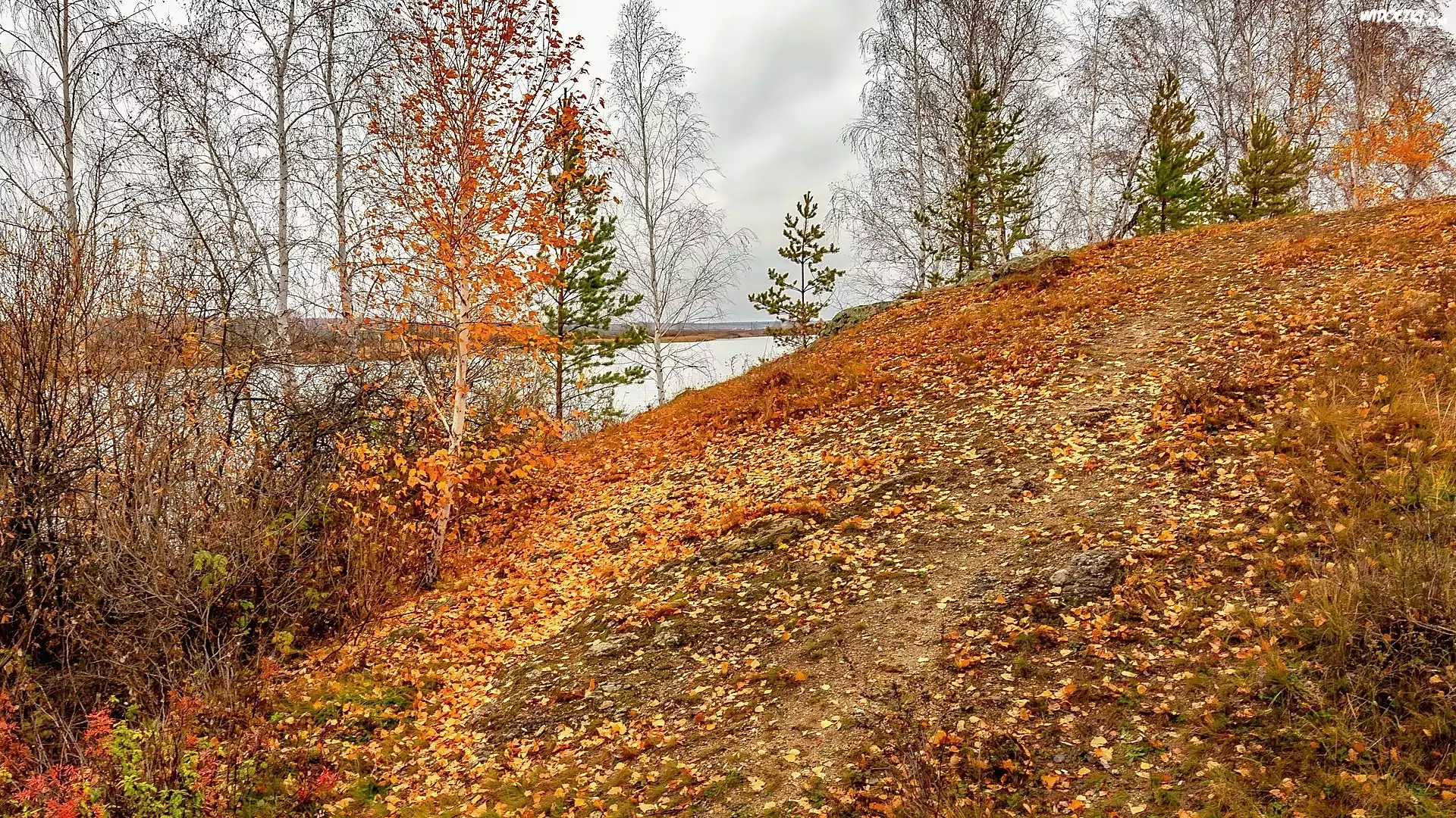 Jesień, Drzewa, Brzozy, Liście, Skarpa, Rzeka Kabanka, Demarino, Obwód czelabiński, Rosja
