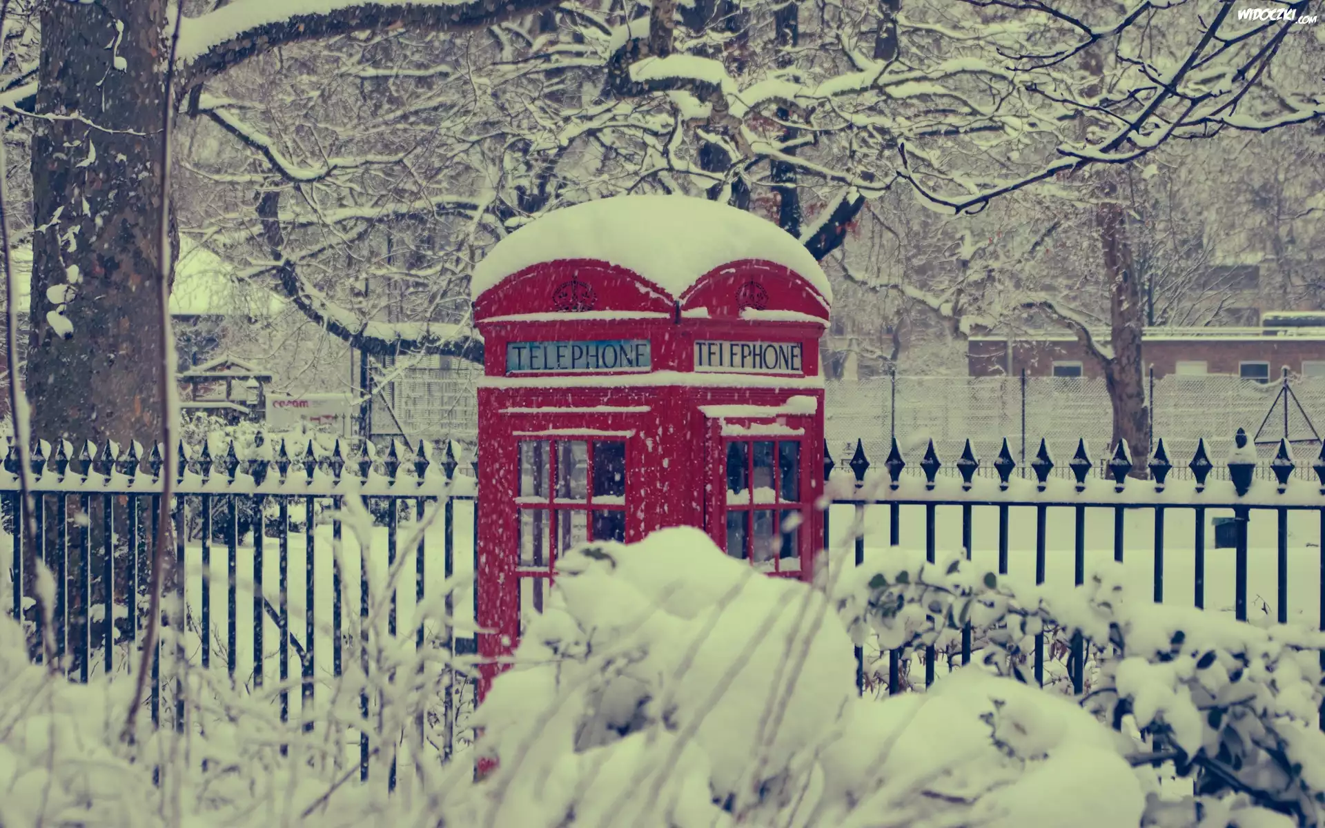 Czerwona, Budka, Telefoniczna, Ośnieżone, Drzewa, Krzewy, Ulica, Płot