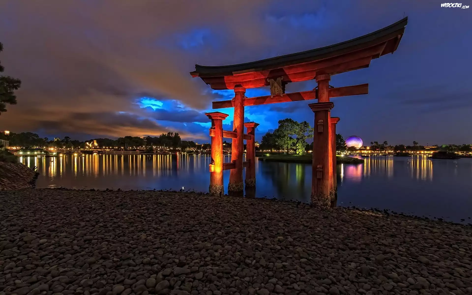 Japońska, Budowla, Rzeka, Brzeg, Kamienie, Wieczór, Światła, Odbicie