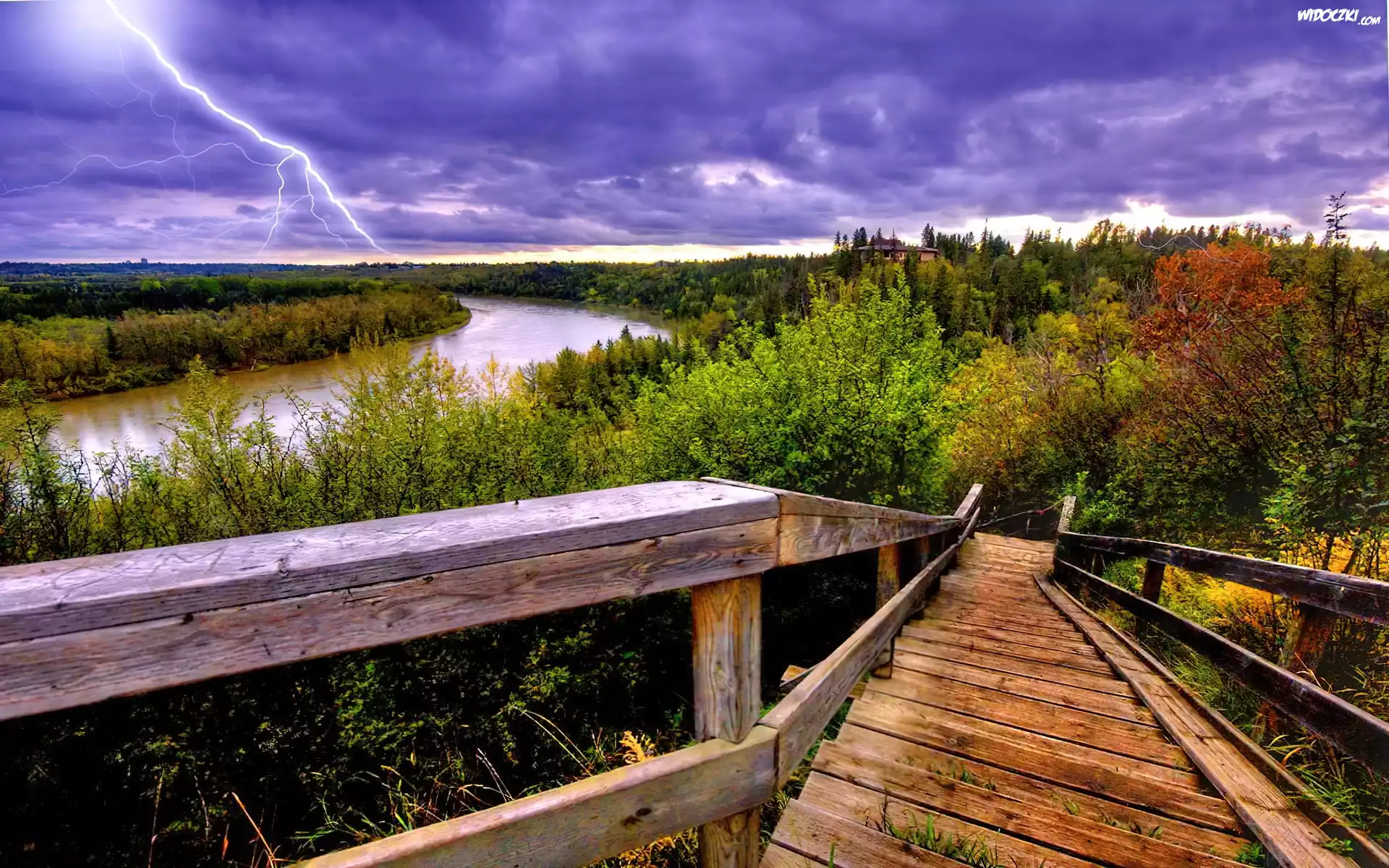 Zdjęcia, Burza, Rzeka, Las, Schody