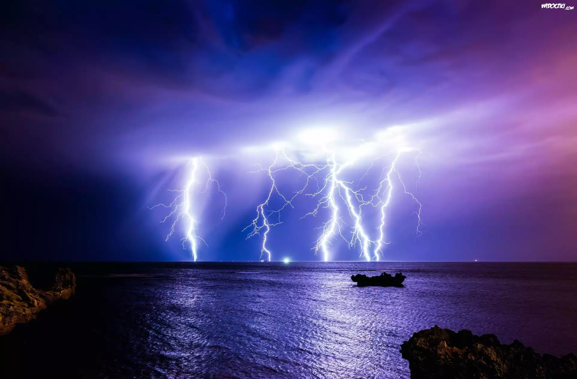 Zdjęcia, Burza, Pioruny, Błyskawica, Morze, Noc