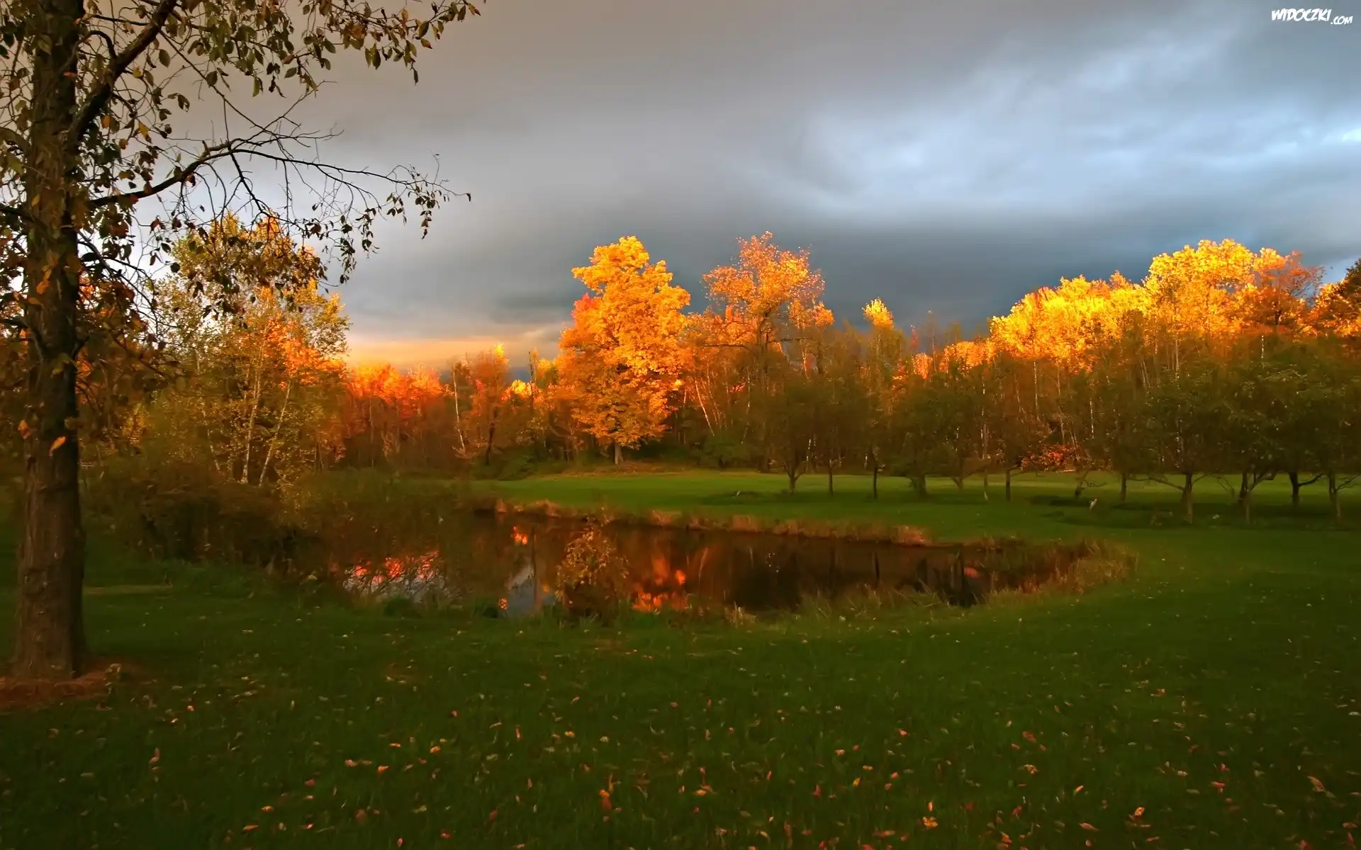 Zdjęcia, Burzowe, Niebo, Złote, Drzewa, Staw