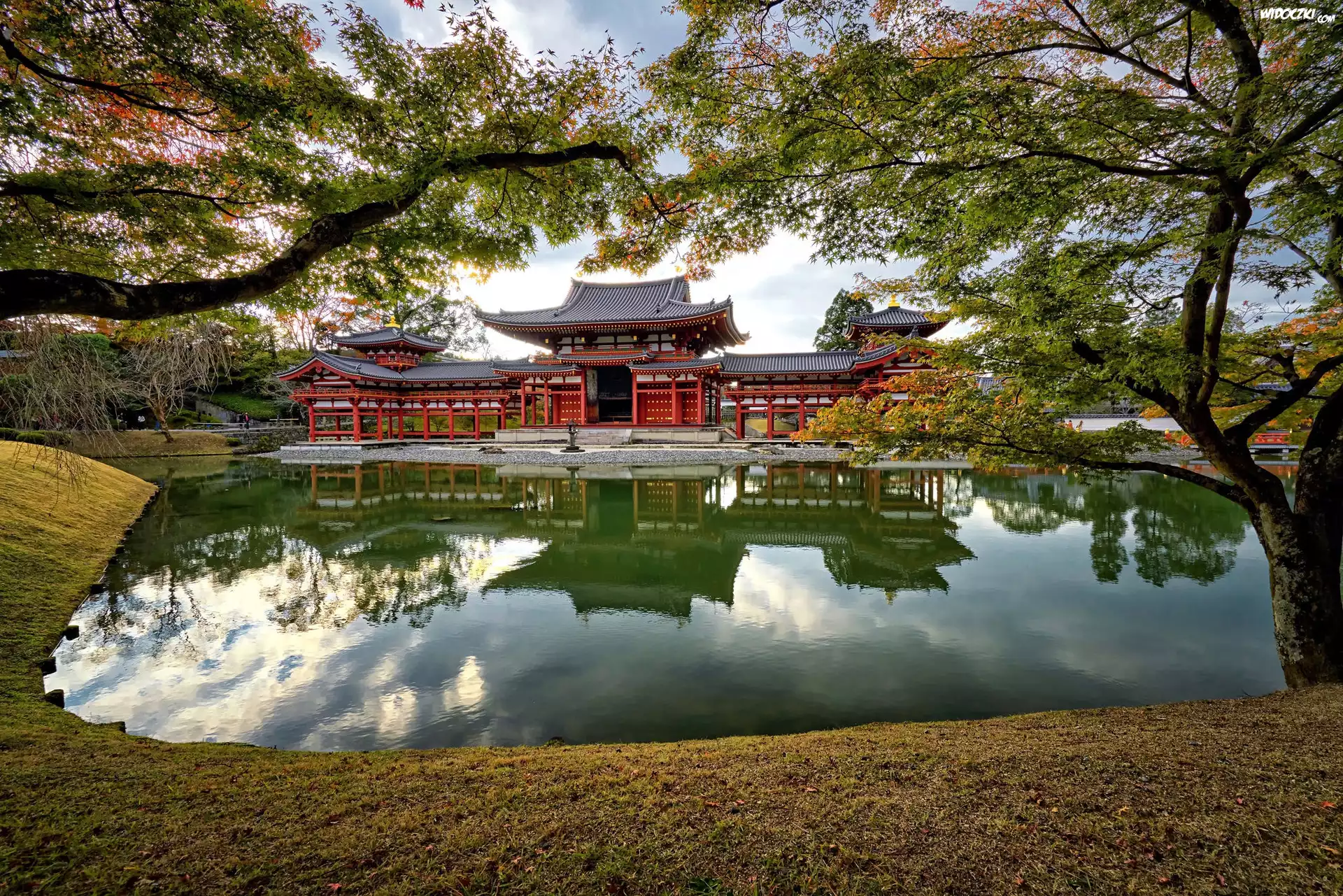 Zdjęcia, Buddyjska, Świątynia Byodo-in, Pawilon Feniksa, Staw, Drzewa, Miasto Uji, Japonia