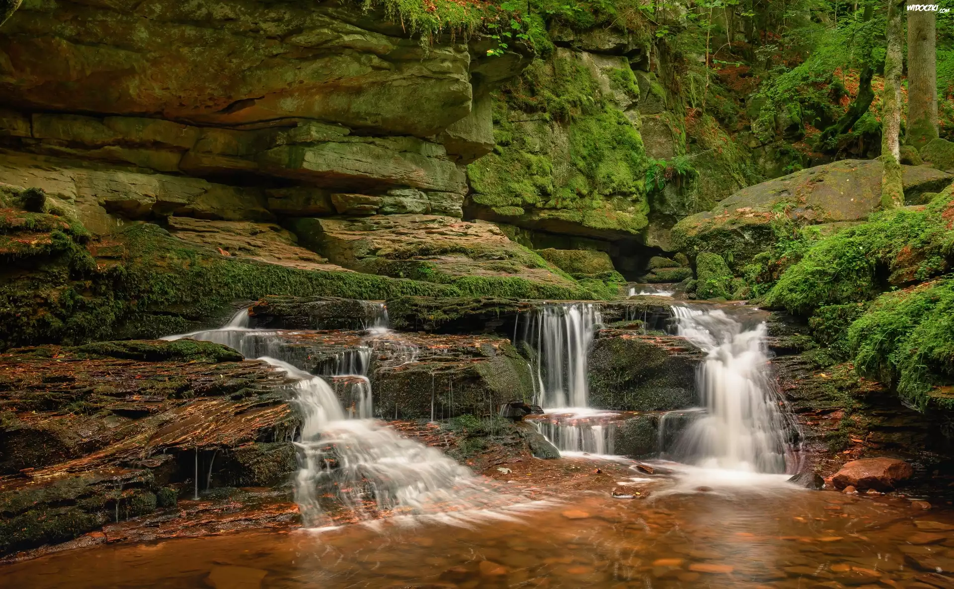 Niemcy, Badenia-Wirtembergia, Powiat Calw, Schwarzwald, Potok Monbach, Skały, Rzeka, Progi skalne, Drzewa, Mech |
