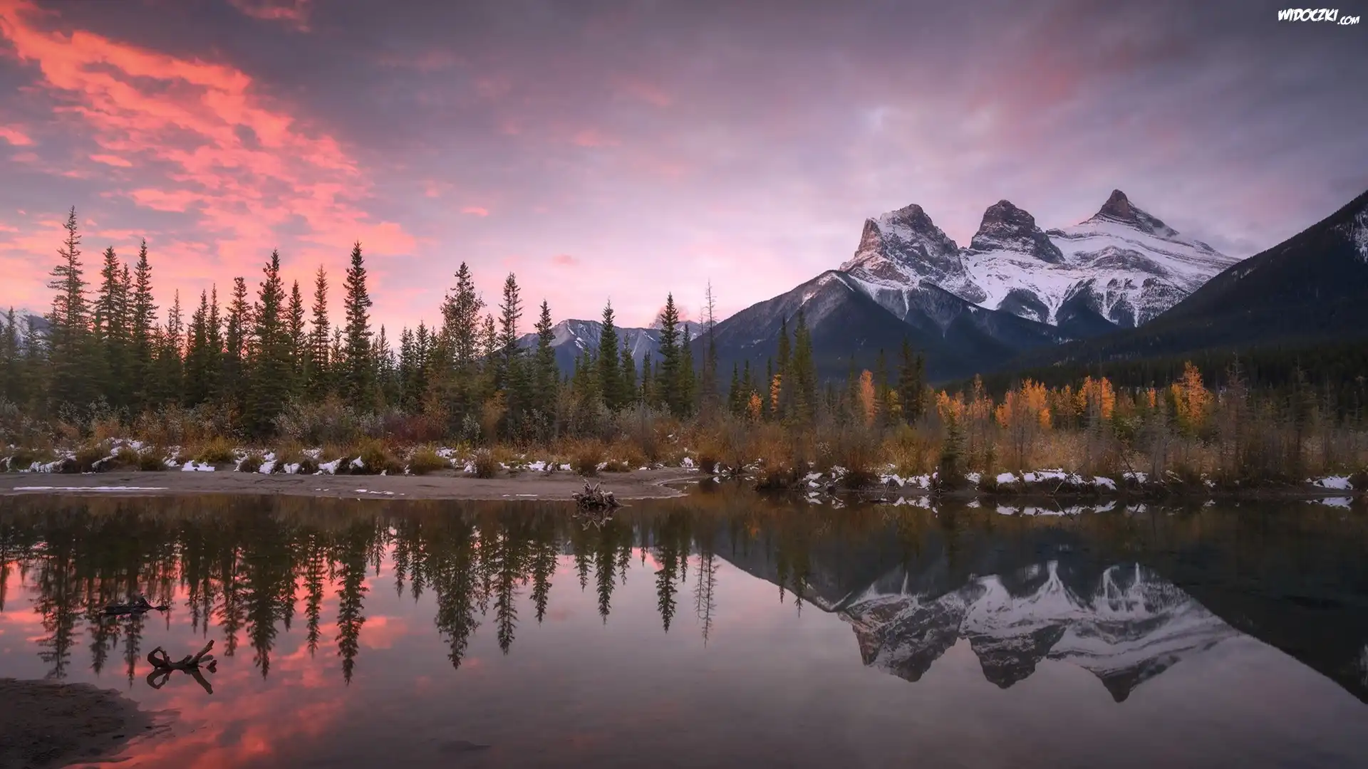 Kanada, Alberta, Canmore, Góry, Canadian Rockies, Góra Three Sisters, Rzeka, Bow River, Drzewa, Chmury |