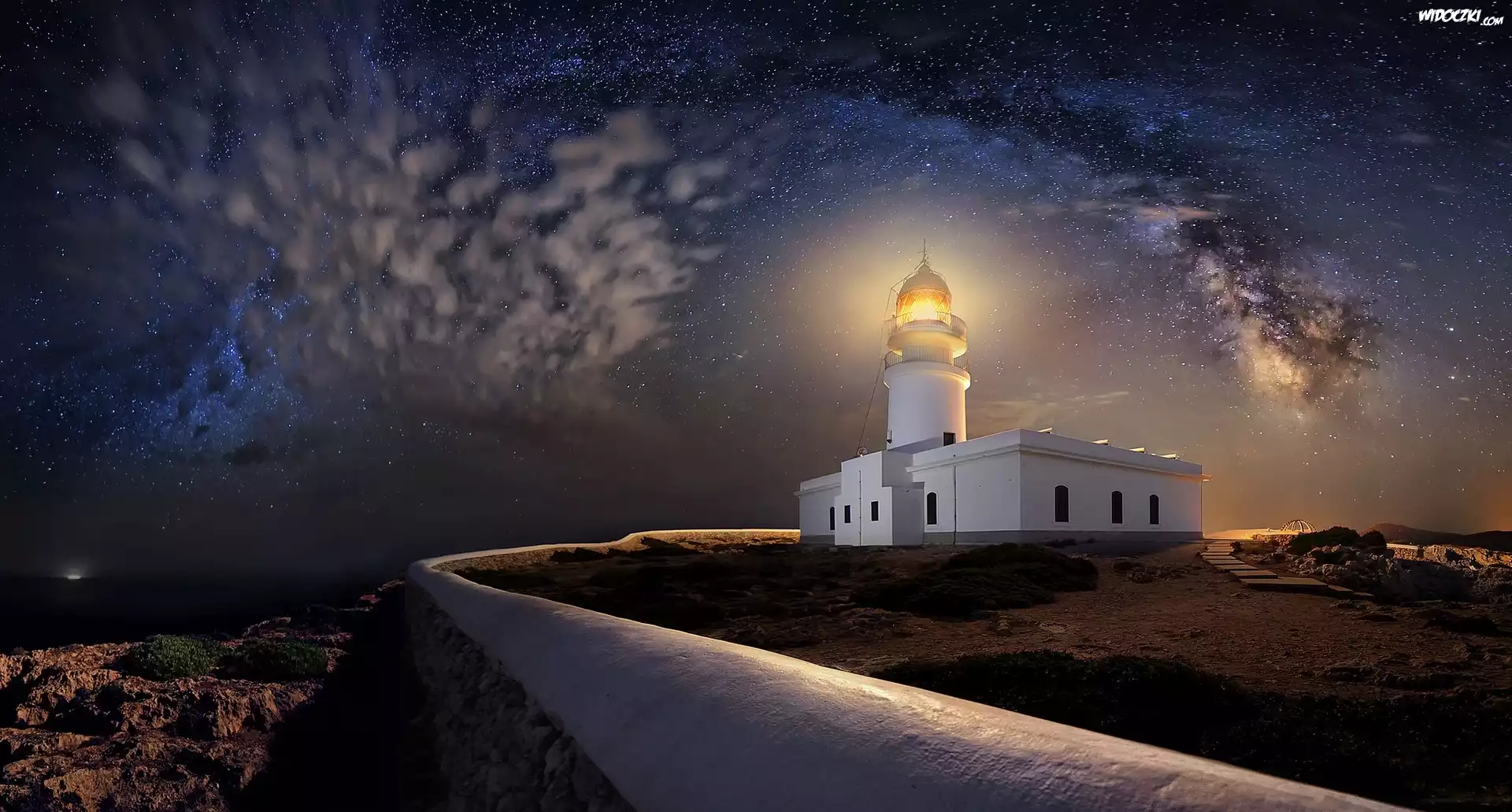 Hiszpania, Wyspa Minorka, Przylądek Cap de Cavalleria, Wybrzeże, Latarnia morska Far de Cavalleria, Noc |